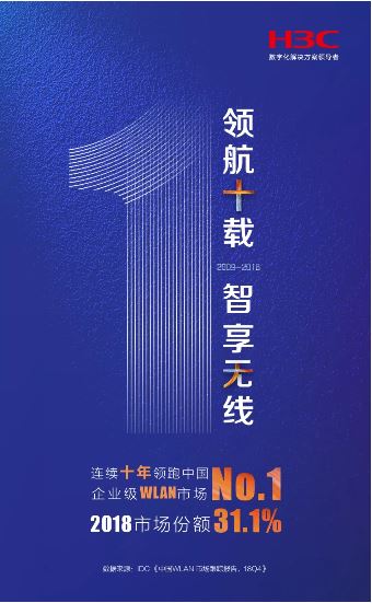 近日, 全球權(quán)威ICT市場研究機構(gòu)IDC發(fā)布的《中國WLAN市場跟蹤報告,18Q4》顯示,紫光旗下新華三集團以31.1%的市場份額位居2018年中國企業(yè)級WLAN市場第一。從2009年到2018年,新華三已連續(xù)十年蟬聯(lián)中國企業(yè)級WLAN市場占有率第一,成為當之無愧的行業(yè)領(lǐng)袖,彰顯了新華三在WLAN領(lǐng)域領(lǐng)先的技術(shù)實力與始終如一的可靠品質(zhì)。